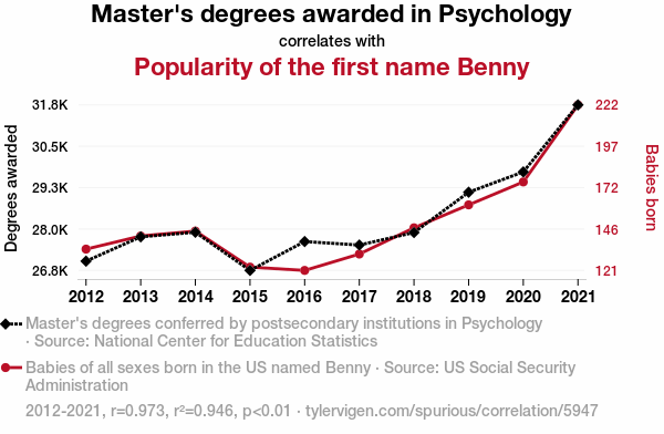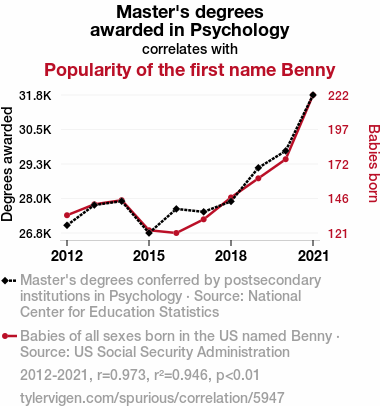 This means 94.6% of the change in the one variable (i.e., Popularity of the first name Benny) is predictable based on the change in the other (i.e., Master's degrees awarded in Psychology) over the 10 years from 2012 through 2021.