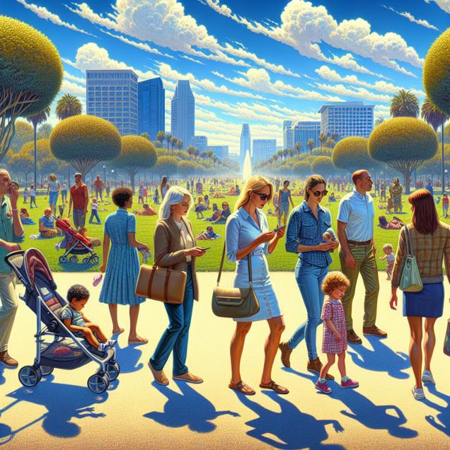 Prompt: Create an image of a vibrant park scene in San Diego, capturing the clear blue sky with families strolling and children playing. Among them, depict a couple engaged in a discussion about baby names, specifically considering the name "Kirk". The atmosphere should emanate a sense of joy and relief as the decreased pollution levels allow people to relish the fresh air and consider baby names freely and without hesitation. The image should convey a realistic and soothing ambiance, celebrating the newfound clarity and freedom in the environment. The depiction should include only scenes, people, and objects, it should not include text or speech bubbles.
