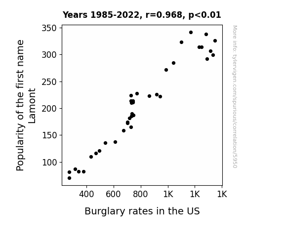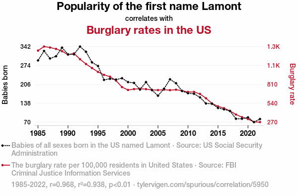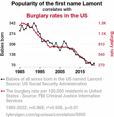- The spurious research paper: Larceny and Lamont: An Analysis of the Link between the Popularity of the First Name Lamont and Burglary Rates in the United States