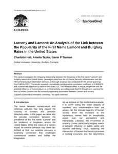 Larceny and Lamont: An Analysis of the Link between the Popularity of the First Name Lamont and Burglary Rates in the United States The Journal of Quirky Social Trends Jan 2024 Reminder: This paper is AI-generated. Not real! |