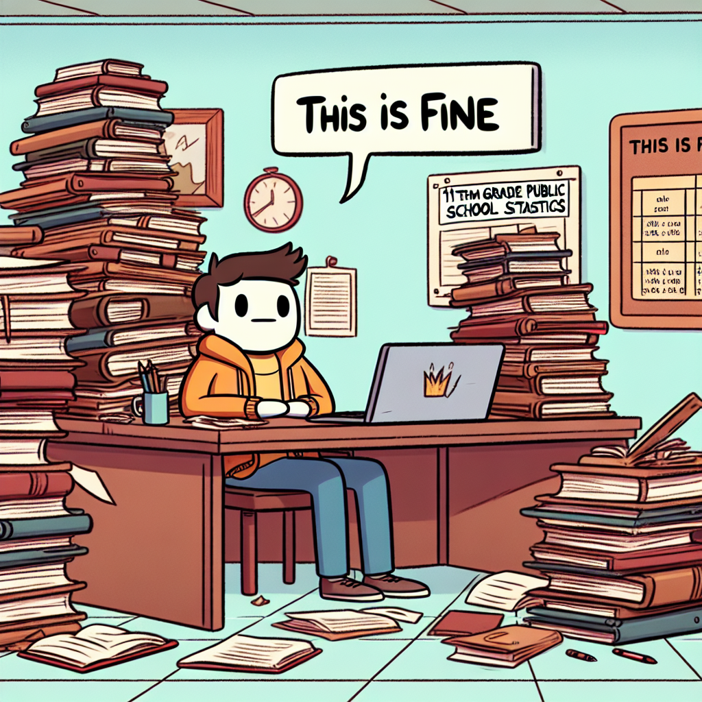 Create a meme inspired by the this is fine meme that in some way references Number of public school students in 11th grade. Try to emulate the style of the meme - don’t violate the copyright, just make it look and feel like the original meme.