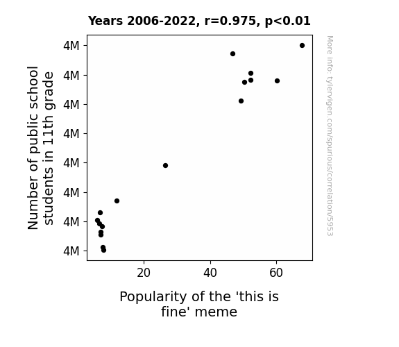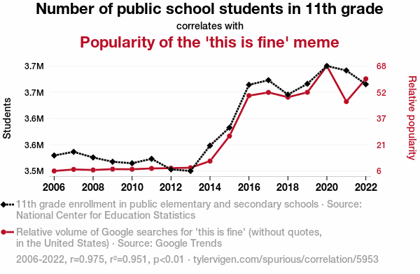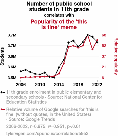 This means 95.1% of the change in the one variable (i.e., Popularity of the 'this is fine' meme) is predictable based on the change in the other (i.e., Number of public school students in 11th grade) over the 17 years from 2006 through 2022.