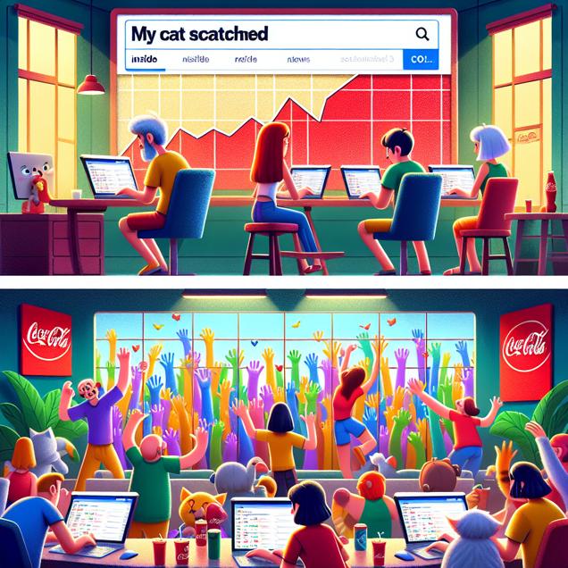ChatGPT: In the visual scene, we see an increasing number of people typing 'my cat scratched me' into their Google search bar. Concurrently, we see a line graph depicting an upward trend in The Coca-Cola Company's stock price (KO). In the background, a group of people are seen reaching for cans of Coca-Cola, with satisfied expressions on their faces as they enjoy the refreshing beverage.