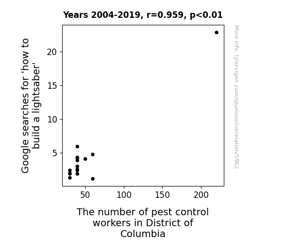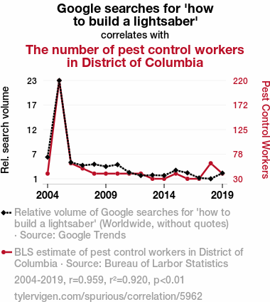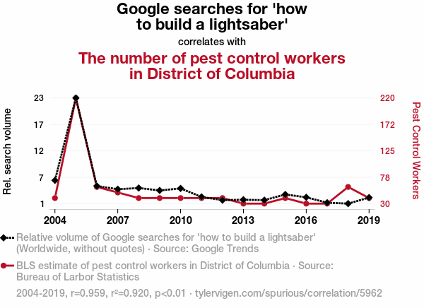 - The spurious research paper: Shining a Light on Lightsaber Longings: Analyzing the Association Between Google Searches for 'How to Build a Lightsaber' and Pest Control Employment in the District of Columbia