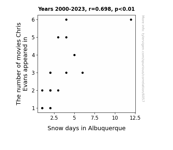 This means 48.7% of the change in the one variable (i.e., Snow days in Albuquerque) is predictable based on the change in the other (i.e., The number of movies Chris Evans appeared in) over the 19 years from 2000 through 2023.