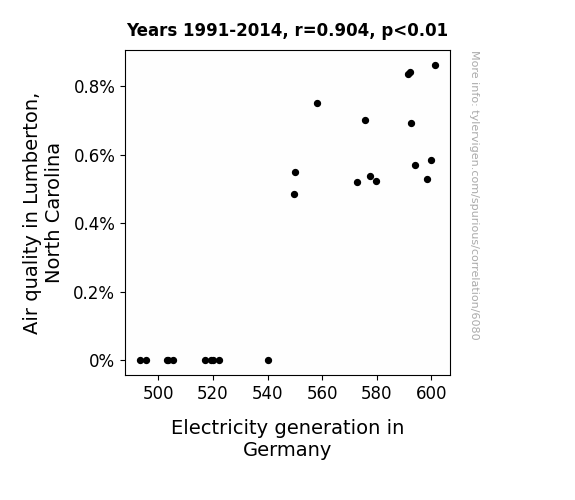 This means 81.7% of the change in the one variable (i.e., Electricity generation in Germany) is predictable based on the change in the other (i.e., Air quality in Lumberton, North Carolina) over the 24 years from 1991 through 2014.