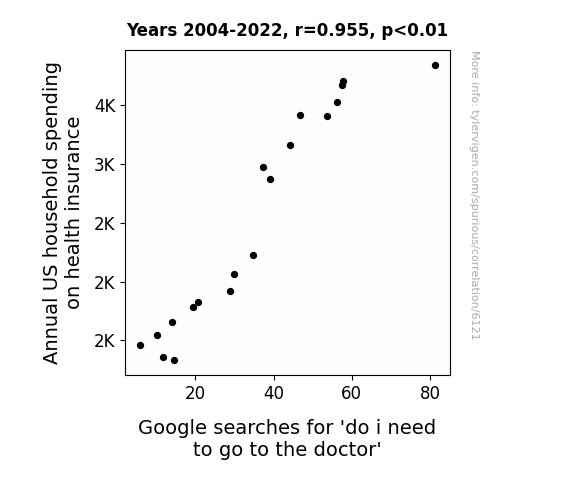 This means 91.1% of the change in the one variable (i.e., Google searches for 'do i need to go to the doctor') is predictable based on the change in the other (i.e., Annual US household spending on health insurance) over the 19 years from 2004 through 2022.