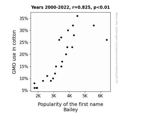 This means 68.1% of the change in the one variable (i.e., Popularity of the first name Bailey) is predictable based on the change in the other (i.e., GMO use in cotton) over the 23 years from 2000 through 2022.