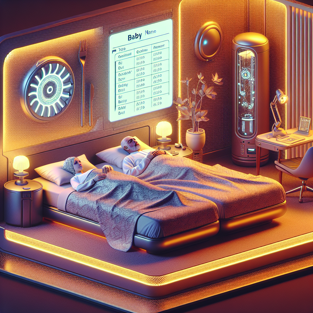 ChatGPT: Generate an image of a bedroom with a futuristic twist. The room should have a cozy atmosphere, with a bed made of altered cotton bedding that lacks its former softness due to a decrease in GMO use. People should be depicted tossing and turning restlessly in discomfort. A baby name book should be visible on the bedside table, with the name Bailey losing popularity in favor of easier-to-pronounce and spell names. The scene should portray a subtle sense of unease and shortage, with a futuristic touch in the decor and lighting.