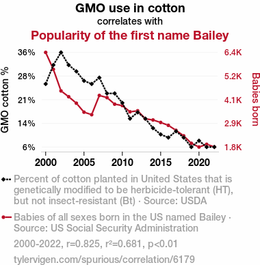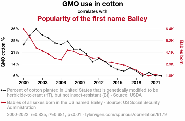 This means 68.1% of the change in the one variable (i.e., Popularity of the first name Bailey) is predictable based on the change in the other (i.e., GMO use in cotton) over the 23 years from 2000 through 2022.