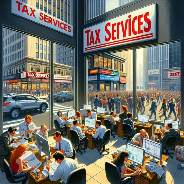Prompt: Create an image of a TIME magazine cover showcasing a bustling street in downtown Arizona. The street is lined with small tax preparation offices, each proudly displaying "Tax Services" signs. Inside one office, a group of clever tax preparers huddles around a computer, excitedly pointing to a screen displaying a complex financial report related to Apple's annual net income. Meanwhile, outside the window, an Apple store on the corner gleams in the sunlight, and customers leisurely browse the latest gadgets. The scene captures the unintended impact of the increasing number of tax preparers in Arizona on Apple's annual net income, as a loophole that benefits the tech giant is accidentally discovered. The depiction should include only scenes, people, and objects, it should not include text or speech bubbles.