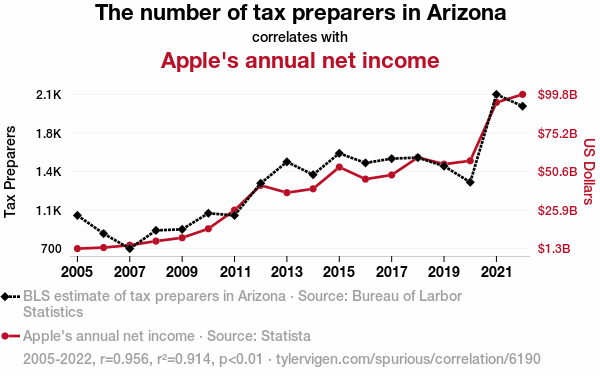 - The spurious research paper: The Big Apple and the Taxing Tally: An Analysis of the Relationship Between the Number of Tax Preparers in Arizona and Apple's Annual Net Income