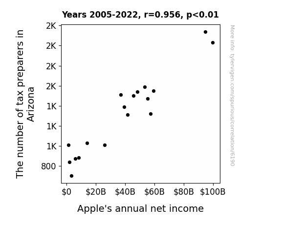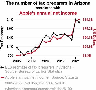 tax preparers, Arizona, Apple, annual net income, correlation, Bureau of Labor Statistics, Statista, economics, relationship, Arizona tax preparers, Apple annual net income, correlation coefficient, p-value, tax preparation, technology behemoths