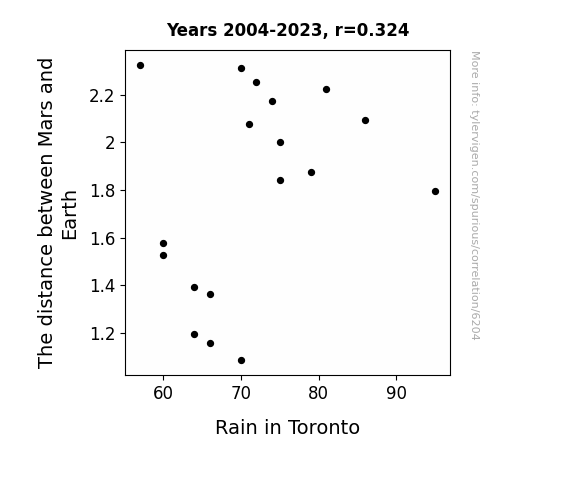 This means 10.5% of the change in the one variable (i.e., Rain in Toronto) is predictable based on the change in the other (i.e., The distance between Mars and Earth) over the 18 years from 2004 through 2023.