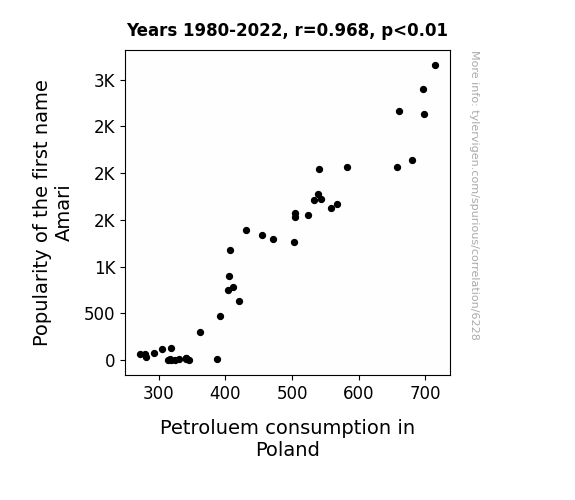 This means 93.7% of the change in the one variable (i.e., Petroluem consumption in Poland) is predictable based on the change in the other (i.e., Popularity of the first name Amari) over the 43 years from 1980 through 2022.