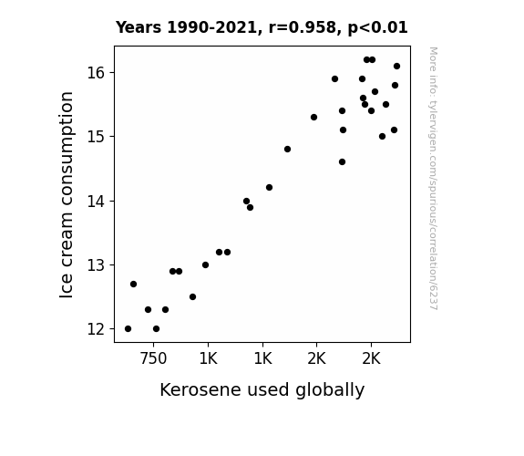 This means 91.8% of the change in the one variable (i.e., Kerosene used globally) is predictable based on the change in the other (i.e., Ice cream consumption) over the 32 years from 1990 through 2021.