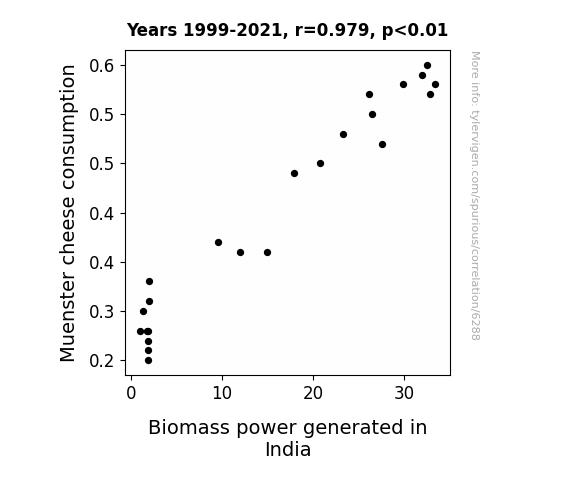 This means 95.9% of the change in the one variable (i.e., Biomass power generated in India) is predictable based on the change in the other (i.e., Muenster cheese consumption) over the 23 years from 1999 through 2021.