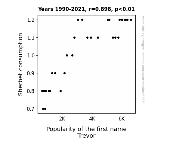 This means 80.7% of the change in the one variable (i.e., Popularity of the first name Trevor) is predictable based on the change in the other (i.e., Sherbet consumption) over the 32 years from 1990 through 2021.