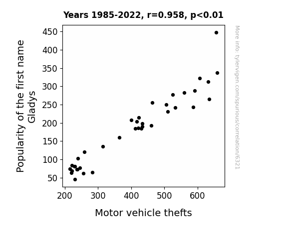 This means 91.9% of the change in the one variable (i.e., Motor vehicle thefts) is predictable based on the change in the other (i.e., Popularity of the first name Gladys) over the 38 years from 1985 through 2022.
