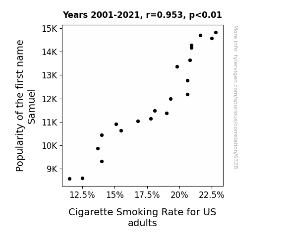 This means 90.8% of the change in the one variable (i.e., Cigarette Smoking Rate for US adults) is predictable based on the change in the other (i.e., Popularity of the first name Samuel) over the 21 years from 2001 through 2021.