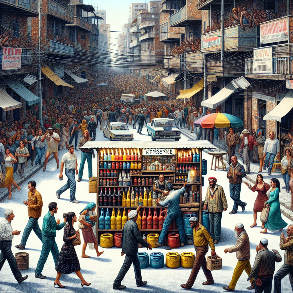 Prompt: Generate an image depicting a bustling street in Venezuela, with a small kerosene vendor stand noticeably less busy. The street should be filled with people, some of whom seem to be less interested in kerosene. A few individuals are walking by, observing the decrease in demand for kerosene. In the midst of the scene, a few people can be heard discussing the drop in demand, mentioning the name "Gerard." The visual should capture the atmosphere of the street and convey the change in kerosene demand, with subtle hints of the conversations about "Gerard" in the background. The depiction should include only scenes, people, and objects, it should not include text or speech bubbles.