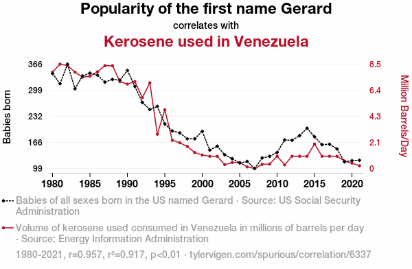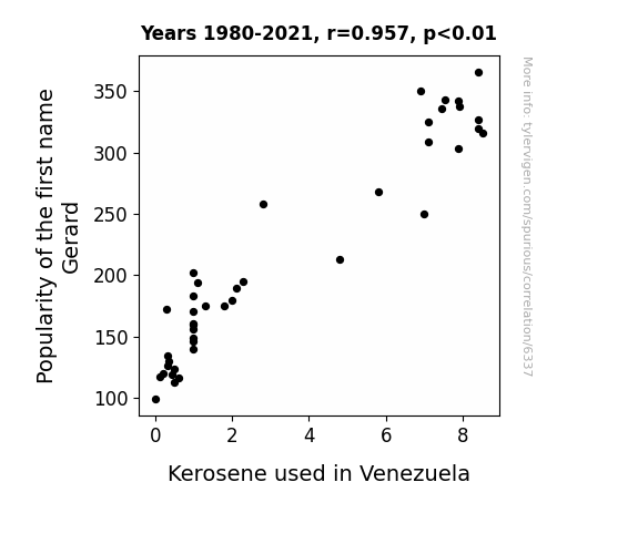 This means 91.7% of the change in the one variable (i.e., Kerosene used in Venezuela) is predictable based on the change in the other (i.e., Popularity of the first name Gerard) over the 42 years from 1980 through 2021.