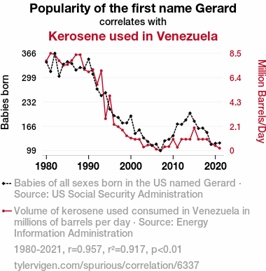 User prompt: Please provide potential search keywords for a paper titled The Kerosene Connection: Gerard's Popularity and Venezuelan Volatility with an abstract of In this study, we investigate the unexpected correlation between the popularity of the first name Gerard and the usage of kerosene in Venezuela. Combining data from the US Social Security Administration and the Energy Information Administration, we delve into the enigmatic relationship that has kept researchers in the dark, metaphorically speaking. Our analysis spans over four decades, from 1980 to 2021, and reveals a startling correlation coefficient of 0.9573473 and a p-value that evokes statistical significance. We undertake a lighthearted exploration of this curious connection, uncovering peculiar patterns and drawing attention to the comical confluence of names and flammable fuels. Our findings offer a glimpse into the whimsical world of data analysis, where correlations may ignite sparks of curiosity and laughter in the minds of intrepid researchers.