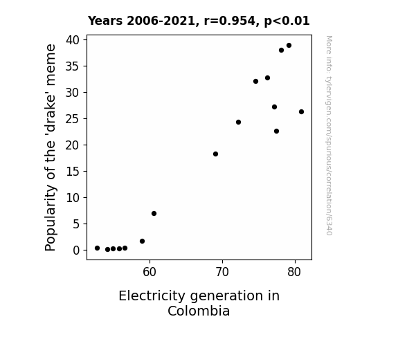 This means 91% of the change in the one variable (i.e., Electricity generation in Colombia) is predictable based on the change in the other (i.e., Popularity of the 'drake' meme) over the 16 years from 2006 through 2021.