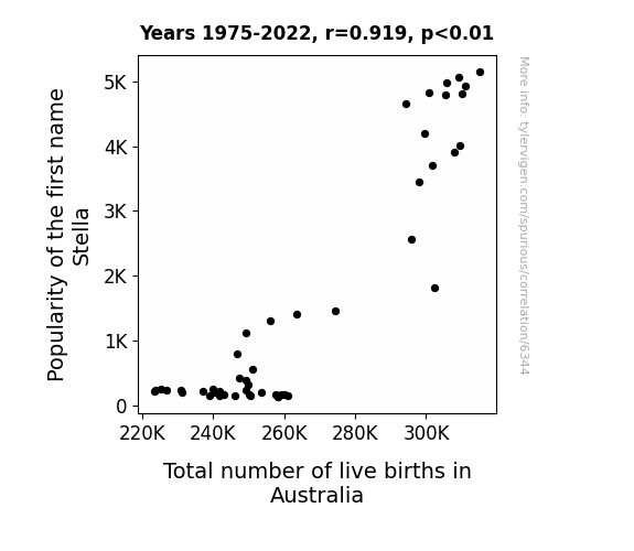 This means 84.4% of the change in the one variable (i.e., Total number of live births in Australia) is predictable based on the change in the other (i.e., Popularity of the first name Stella) over the 48 years from 1975 through 2022.