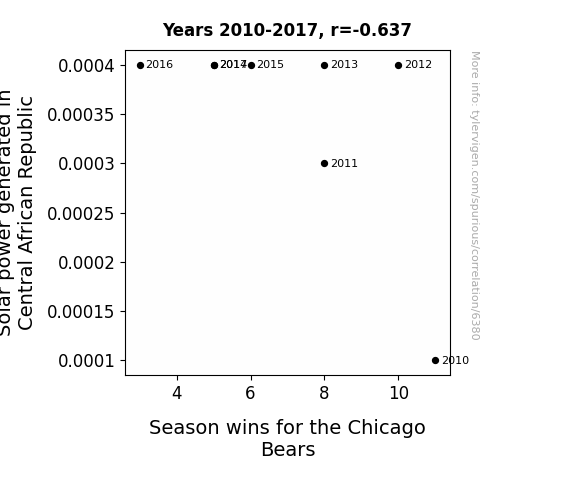 A linear line chart with years as the X-axis and two variables on the Y-axis. The first variable is Solar power generated in Central African Republic and the second variable is Season wins for the Chicago Bears.  The chart goes from 2010 to 2017, and the two variables track closely in value over that time. Small Image
