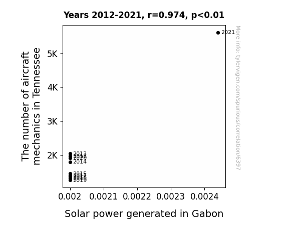 This means 94.8% of the change in the one variable (i.e., Solar power generated in Gabon) is predictable based on the change in the other (i.e., The number of aircraft mechanics in Tennessee) over the 10 years from 2012 through 2021.