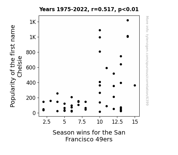 This means 26.7% of the change in the one variable (i.e., Season wins for the San Francisco 49ers) is predictable based on the change in the other (i.e., Popularity of the first name Chelsie) over the 48 years from 1975 through 2022.