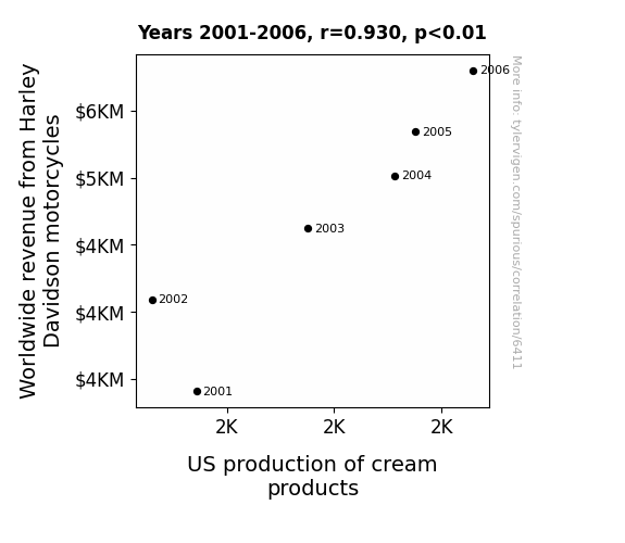 This means 86.4% of the change in the one variable (i.e., US production of cream products) is predictable based on the change in the other (i.e., Worldwide revenue from Harley Davidson motorcycles) over the 6 years from 2001 through 2006.