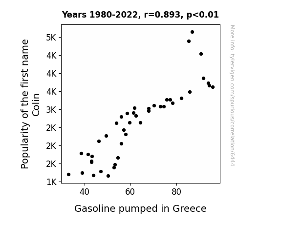 This means 79.7% of the change in the one variable (i.e., Gasoline pumped in Greece) is predictable based on the change in the other (i.e., Popularity of the first name Colin) over the 43 years from 1980 through 2022.