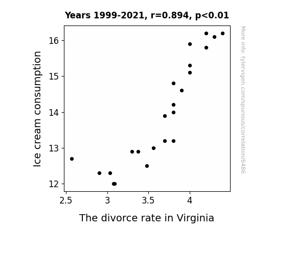 This means 79.9% of the change in the one variable (i.e., The divorce rate in Virginia) is predictable based on the change in the other (i.e., Ice cream consumption) over the 23 years from 1999 through 2021.