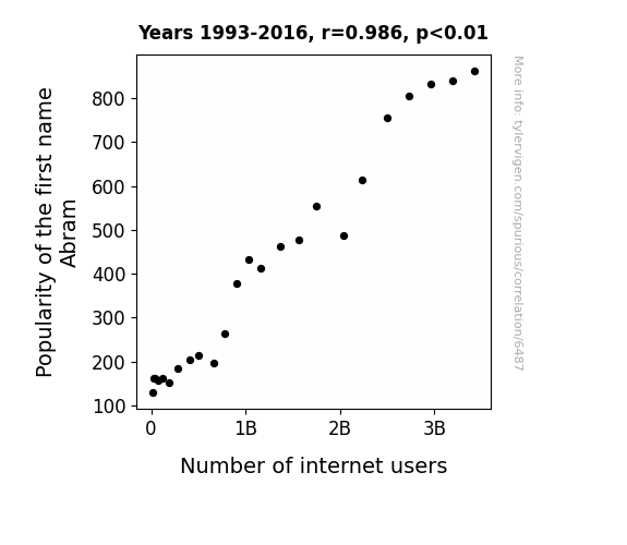 This means 97.3% of the change in the one variable (i.e., Number of internet users) is predictable based on the change in the other (i.e., Popularity of the first name Abram) over the 24 years from 1993 through 2016.
