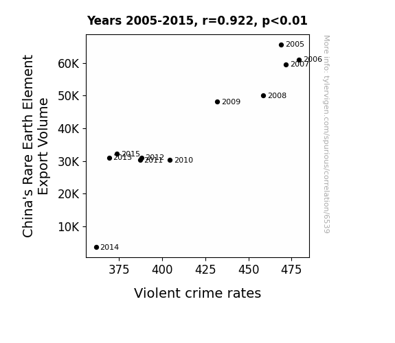 This means 85% of the change in the one variable (i.e., Violent crime rates) is predictable based on the change in the other (i.e., China's Rare Earth Element Export Volume) over the 11 years from 2005 through 2015.