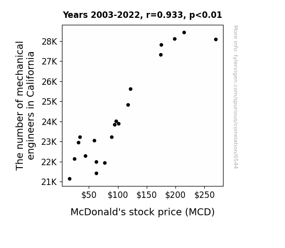 This means 87.1% of the change in the one variable (i.e., McDonald's stock price (MCD)) is predictable based on the change in the other (i.e., The number of mechanical engineers in California) over the 20 years from 2003 through 2022.