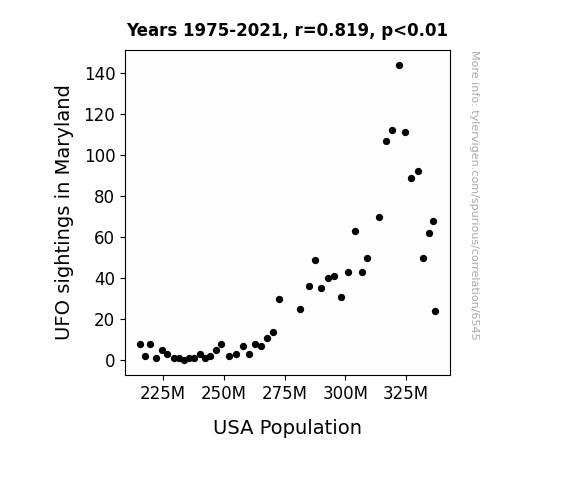 This means 67.1% of the change in the one variable (i.e., USA Population) is predictable based on the change in the other (i.e., UFO sightings in Maryland) over the 47 years from 1975 through 2021.