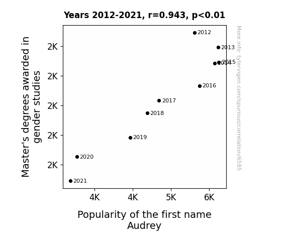 This means 88.9% of the change in the one variable (i.e., Popularity of the first name Audrey) is predictable based on the change in the other (i.e., Master's degrees awarded in gender studies) over the 10 years from 2012 through 2021.