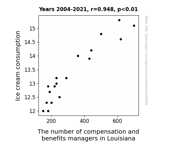 This means 89.9% of the change in the one variable (i.e., The number of compensation and benefits managers in Louisiana) is predictable based on the change in the other (i.e., Ice cream consumption) over the 18 years from 2004 through 2021.