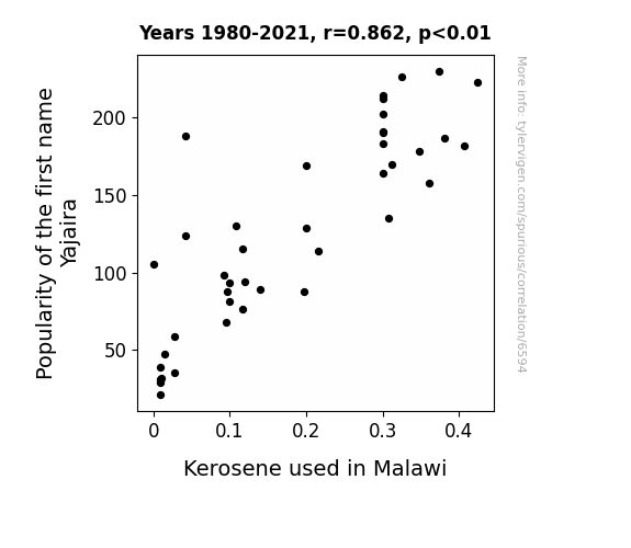 This means 74.3% of the change in the one variable (i.e., Kerosene used in Malawi) is predictable based on the change in the other (i.e., Popularity of the first name Yajaira) over the 42 years from 1980 through 2021.