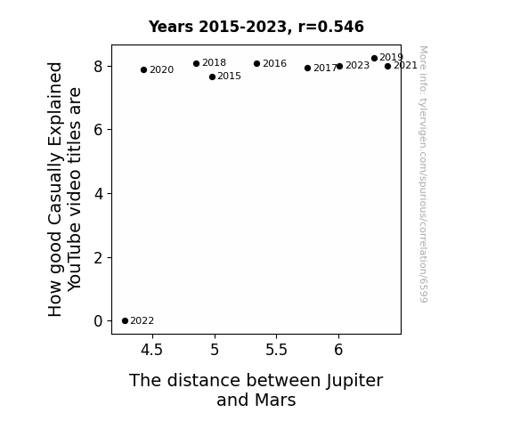 This means 29.8% of the change in the one variable (i.e., The distance between Jupiter and Mars) is predictable based on the change in the other (i.e., How good Casually Explained YouTube video titles are) over the 9 years from 2015 through 2023.