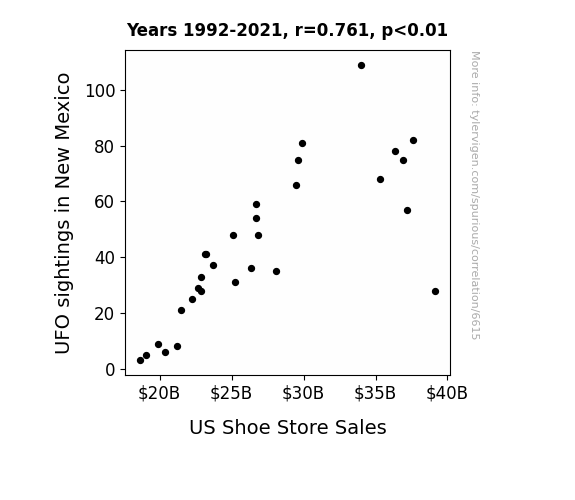 This means 58% of the change in the one variable (i.e., US Shoe Store Sales) is predictable based on the change in the other (i.e., UFO sightings in New Mexico) over the 30 years from 1992 through 2021.