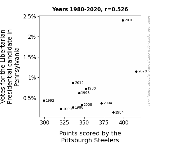This means 27.7% of the change in the one variable (i.e., Points scored by the Pittsburgh Steelers) is predictable based on the change in the other (i.e., Votes for the Libertarian Presidential candidate in Pennsylvania) over the 11 years from 1980 through 2020.