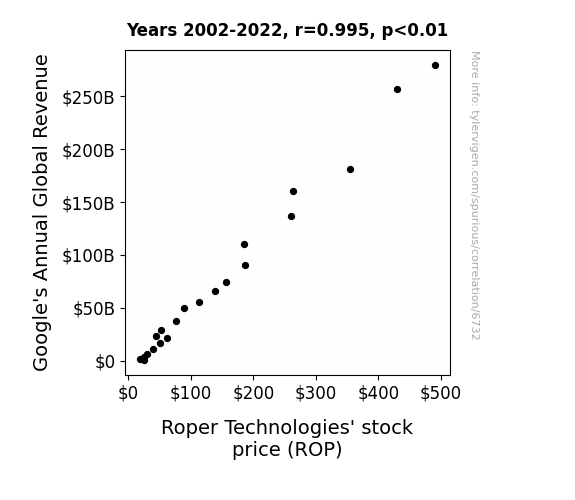 This means 99% of the change in the one variable (i.e., Roper Technologies' stock price (ROP)) is predictable based on the change in the other (i.e., Google's Annual Global Revenue) over the 21 years from 2002 through 2022.