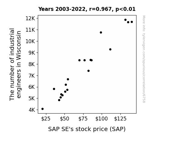 This means 93.6% of the change in the one variable (i.e., SAP SE's stock price (SAP)) is predictable based on the change in the other (i.e., The number of industrial engineers in Wisconsin) over the 20 years from 2003 through 2022.