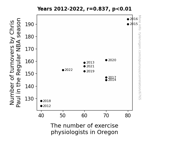 This means 70% of the change in the one variable (i.e., The number of exercise physiologists in Oregon) is predictable based on the change in the other (i.e., Number of turnovers by Chris Paul in the Regular NBA season) over the 11 years from 2012 through 2022.