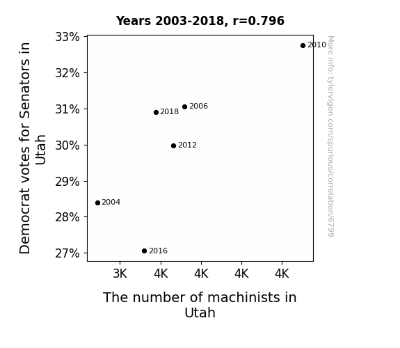 This means 63.4% of the change in the one variable (i.e., The number of machinists in Utah) is predictable based on the change in the other (i.e., Democrat votes for Senators in Utah) over the 6 years from 2003 through 2018.