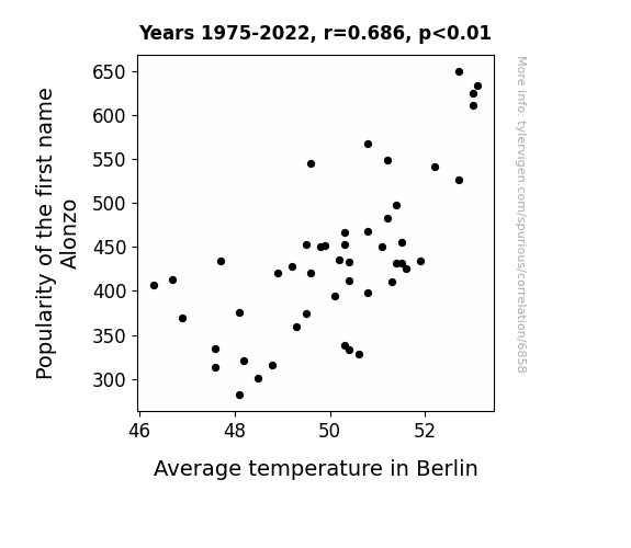 This means 47.1% of the change in the one variable (i.e., Average temperature in Berlin) is predictable based on the change in the other (i.e., Popularity of the first name Alonzo) over the 48 years from 1975 through 2022.